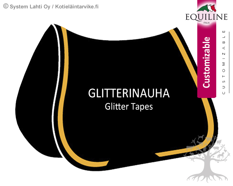 Equiline Satulahuovan Glitterinauha. Equilinen Octagon, Lauren, Quadro, Exarton -satulahuopia voi tilata myös huovan reunaa kiertävällä glitterinauhalla. Huom! Glitterinauhan kanssa voi huopaa lisäkustomoida vain erivärisellä kanttinauhalla. Katso tarkemmin kohta Tilausohje ja tilaa yksilöllinen satulahuopasi!