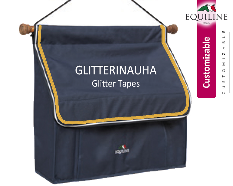 Equiline Tarvikelaukun Glitterinauha. Equilinen tarvikelaukun Holder voi tilata myös tyylikkäällä glitterinauhalla. Huom! Glitterinauhan kanssa voi tarvikelaukkua lisäkustomoida vain erivärisellä kanttinauhalla. Katso tarkemmin kohta Tilausohje!
