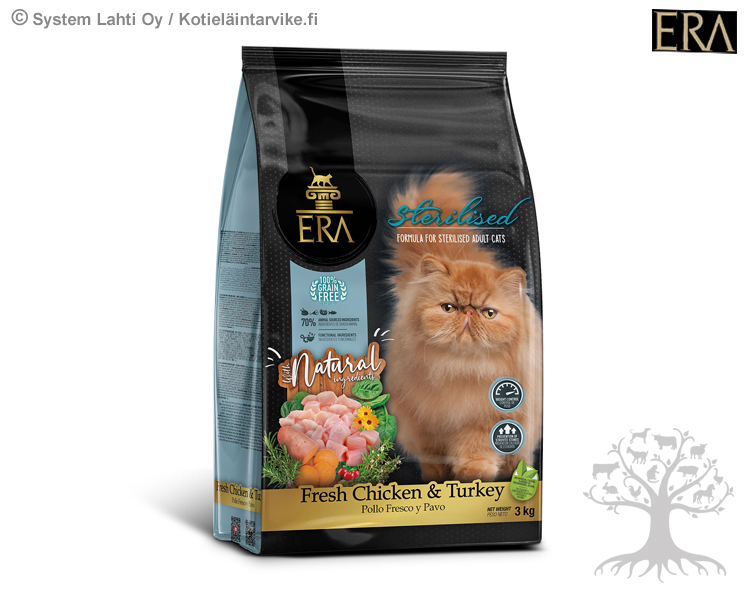 ERA Sterilised Adult Kana & Kalkkuna Viljaton 3kg. ERA Grain-Free Sterilised Adult - Fresh Chicken & Turkey on kanaa ja kalkkunaa sisältävä täysravinto kaikenrotuisille steriloiduille tai ylipainoisille kissoille.
