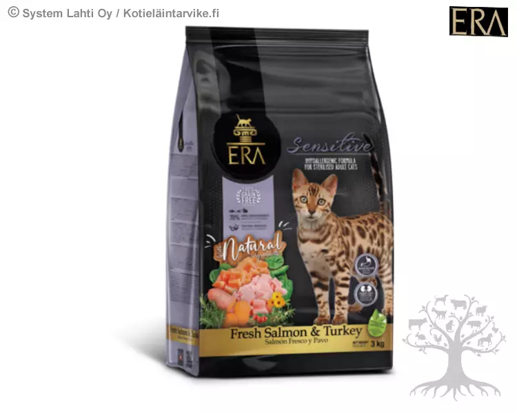 ERA Sterilised Sensitive Adult Lohi & Kalkkuna Viljaton 1,25kg. Täysravinto aikuisille, kastroiduille tai herkkävatsaisille kissoille. Viljaton, helposti sulava resepti, jonka ensimmäinen ainesosa on tuore lohi. Korkea eläinproteiinipitoisuus (yli 50 %): lohta, kalkkunaa ja kananmaksa. Sisältää tauriinia, L-metioniinia ja alhaisen magnesiumpitoisuuden, jotka tukevat virtsateiden ja sydämen terveyttä. Ascophyllum nodosum -merilevä tukee suun ja hampaiden hyvinvointia. Lisätyt probiootit, vitamiinit ja antioksidantit vahvistavat immuunipuolustusta.