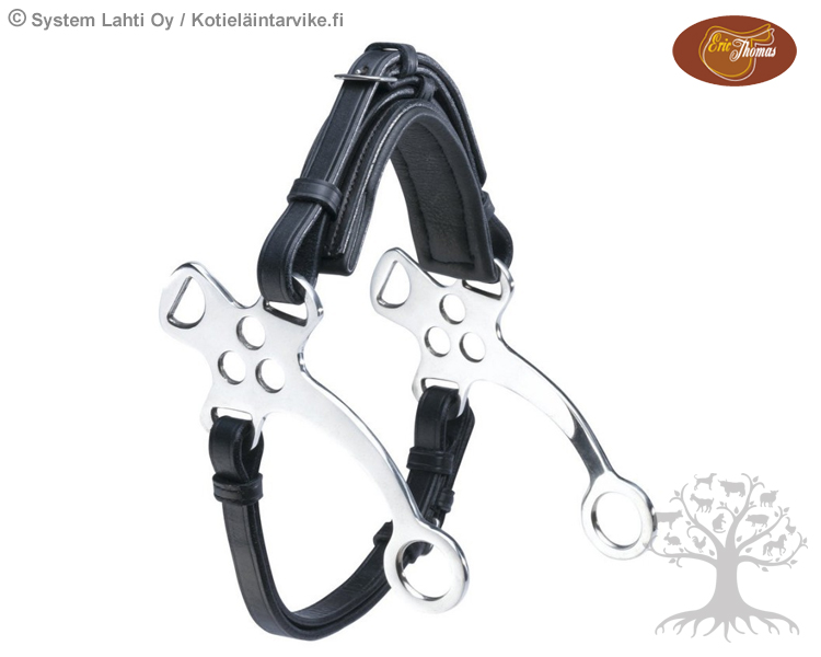 Eric Thomas Hackamore. Laadukas nahkainen hackamore lyhyellä varrella. Hackamoren koko helposti säädettävissä sekä turvan päältä että leuan alta. Turpahihnan pehmusteen leveys noin 42mm ja pituus 180mm. Nahkahihnojen leveys 16mm. Lyhyet hackamorevarret, kokonaispituus noin 190mm. Valmistettu laadukkaasta nahasta ja ruostumattomasta teräksestä. Koko full.
