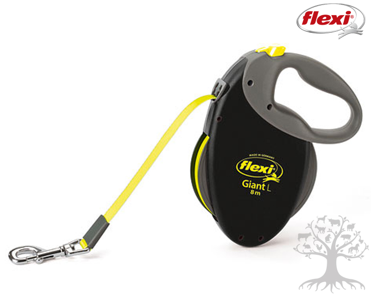 Flexi Giant L Tape 8m (max. 50kg). Flexin uusi nauhallinen kelatalutin Giant, joka on suunnattu suurille koirille. Giant -sarja on suunniteltu käyttömukavuutta ajatellen, se on hyvin käteen sopiva ja ns. "alaspäin pidettävä" -malli. Kelataluttimessa on 8m pitkä pistoolilukollinen ja hyvin pimeässä näkyvä neonkeltainen nauhatalutin, joka antaa lemmikille hyvin liikkumavapautta. Koirille 50kg asti (max. 50kg). Valmistettu Saksassa.