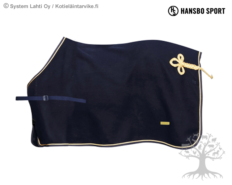 Hansbo Villaratsastusloimi Luxury Navy. Erittäin hieno ja tyylikäs ratsastusloimi on valmistettu laadukkaasta ja paksusta 700g villakankaasta. Ratsastusloimea koristaa kultainen koristenyöri loimen reunoilla, koristeellinen häntäremmi, sekä toisella puolella kullanvärinen Hansbo Sport-koristelaatta. Loimi kiinnitetään satulaan säädettävillä solkikiinnityksillä. Paksu villaloimi lämmittää hevosen selkää ja kuivattaa hevosen nopeasti.