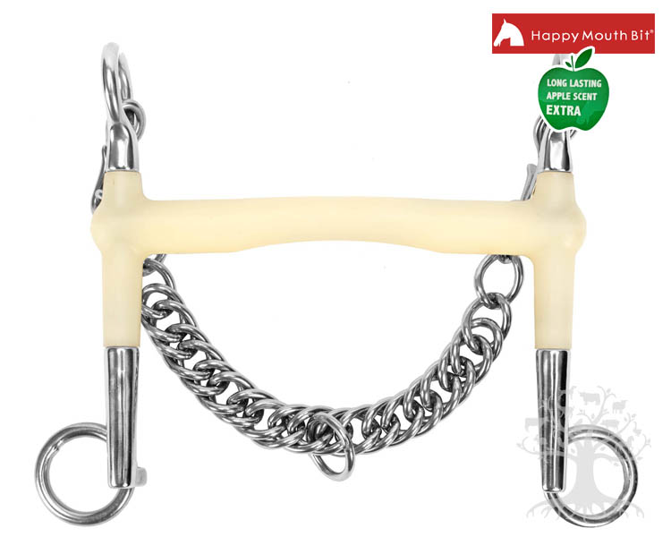 Happy Mouth Weymouth Mullen Apple Extra. Mullen Apple on suorakuolain, jonka suuosa on päällystetty "Long Lasting Extra" omenanmakuisella synteettisellä muovilla. Suorakuolain aiheuttaa voimakasta painetta erityisesti hammaslomaan ja kielelle. Kuolaimella on hevosen päätä alaspäin laskeva vaikutus. Muovisen suuosan sisällä on metallivahvike, joten kuolain ei pääse taipumaan. Valmistettu ruostumattomasta teräksestä ja synteettisestä (kovasta) muovista. Kuolaimen omenanmaku stimuloi hevosen syljen ja liman eritystä toimien ns. "voiteluaineena". Kuolaimen paksuus reunoilta noin 17mm ja keskeltä noin 14mm. Alavarren pituus noin 7.5cm. Synteettisestä muovista valmistetut kuolaimet eivät kestä puremista. Älä käytä kuolainta, jonka pinta on jo vaurioitunut!
