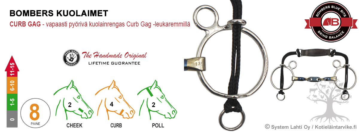 SIVUOSA - Curb Gag on vapaasti pyörivä keskikokoinen (Ø80mm) kuolainrengas, jonka ylä- ja alapuolisten ”lisärenkaiden” läpi kulkee helposti liukuva cub gag -leukaremmi. Curb Gag -kuolainta käytetään aina kaksin ohjin, toiset ohjat kiinnitetään isoimpiin kuolainrenkaisiin ja toiset leukaremmin renkaisiin, näin curb gag -ohjien voimakkaampaa suoraan leukaan kohdistuvaa vaikutusta käytetään vain tarvittaessa. Ylimmistä renkaista kuolain kiinnitetään poskihihnoihin. Alaleukaan kohdistuvalla paineella on hevosen päätä ylöspäin nostava ja hevosen hallittavuutta parantava vaikutus. Ohjastuntuman mukaan curb gag -ohjien käyttö tehostaa myös kuolaimen suuosan vaikutusta, joten kuolaimen suuosa tulee olla hevoselle miellyttävä. Lisäksi Curb Gag sivuosassa on myös sivuittaissuuntaista (cheek) ohjaavaa vaikutusta. Vapaasti pyörivässä kuolainrenkaassa suuosa pääsee liukumaan helposti ja nopeasti, joten ratsastajan ohjasavut siirtyvät ja vapautuvat suuosaan kiinteää kuolainrengasta huomattavasti nopeammin. Curb Gag -kuolaimen mukana tulee nailonista ja nahasta valmistettu curb gag -leukaremmi. Curb Gag -kuolain on erittäin suosittu Euroopassa ja sitä käytetään erityisesti estehevosilla.