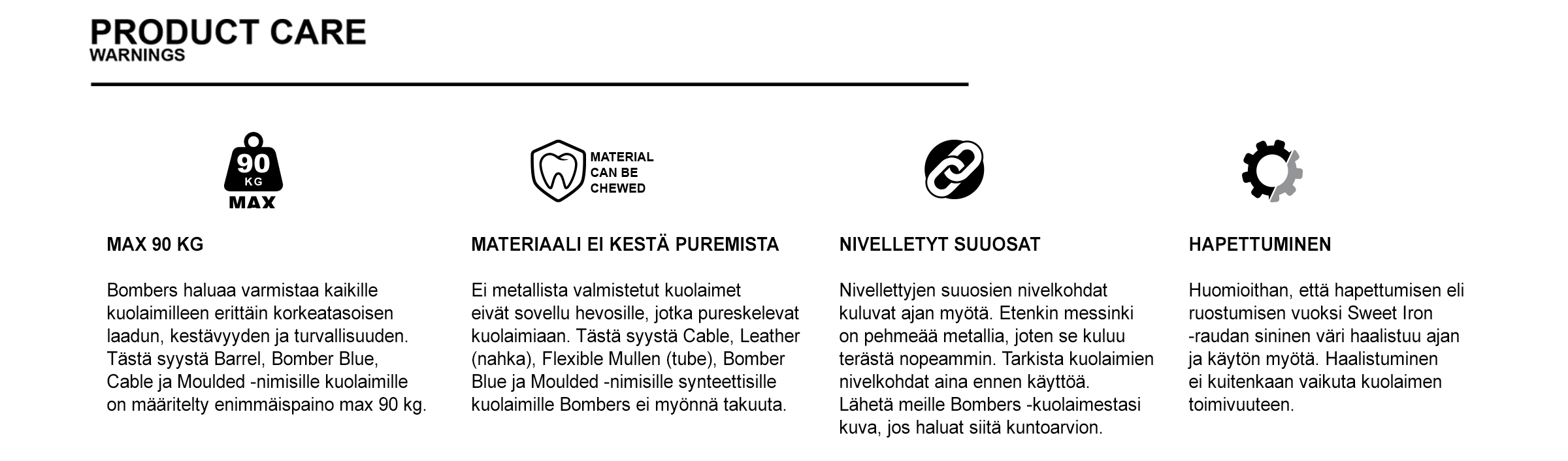 Bombers on kehittänyt ja valmistanut laadukkaita hevostarvikkeita jo yli 30 vuoden ajan. Painopisteenä on ollut aina halu tarjota ja kehittää uusia innovatiivisia ratkaisuja haastaviin kuolainongelmiin. Bombers –kuolaimia onkin aina kehitetty ja testattu yhdessä maailman menestyneimpien ratsastajien kanssa. Tulokset ovat olleet todella hämmästyttäviä!