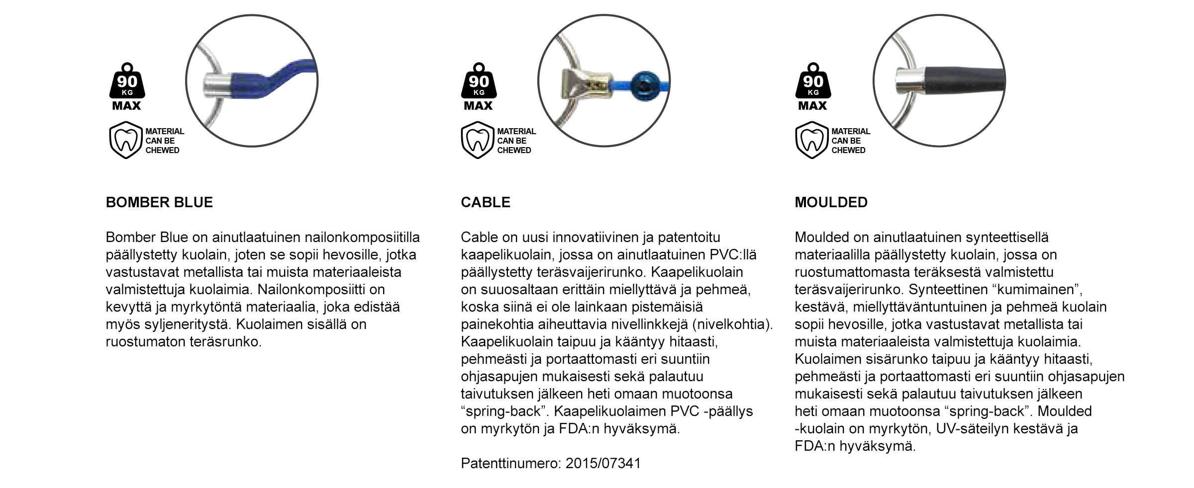 Kotieläintarvikkeella on erittäin laaja valikoima laadukkaita ja vaikutuksiltaan erinomaisia Bombers -kuolaimia, jotka on valmistettu käsityönä hyvin korkealaatuisista materiaaleista. Bombers -kuolaimia saa tilattua myös erikoismittaisina ja -kuolainyhdistelminä. Verkkokaupassamme on myös kattava tietopaketti kuolaimista, joka perustuu täysin kuolainvalmistajan ohjeisiin ja siihen mihin kuolaimet ovat alunperin kehitetty ja mihin eri kuolaimien tehot ja vaikutukset perustuvat. Tutustu lisää Bombersin tuotteisiin www.bombers.co.za.
