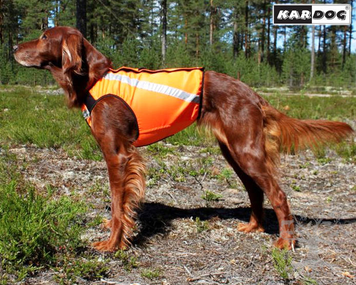 Kardog Sisu Huomioliivi Saksanseisoja 2-värinen. Erittäin laadukas 2-värinen huomioliivi koiralle. Sopii erinomaisesti vaativiin olosuhteisiin, esimerkiksi Saksanseisojille. 2-värisen huomiliivin ansiosta metsästäjä näkee jo kaukaa mihin suuntaan koira haukkuu kohdetta. Liivissä on edessä ja molemmilla sivuilla 3 cm leveät 3M Scotchlite -heijastimet. Liivin selkäpuolella vetoketjukiinnitys, jonka päällä on tarrallinen suojalista. Suojalistan molemmissa päissä on nepparit varmistamassa liivin kiinnitystä. Liivin etuosa on vahvistettu kaksinkertaisella kankaalla. Ulommainen kangas on hankausta ja kulutusta kestävää nailonkangasta, mikä suojaa koiran rintaa ja mahanalustaa raapivilta risuilta sekä talvella jäätävältä lumelta. Liivin selkäpuolella on kankainen talutushihnalenkki, joka on ommeltu pienen kangastaskun sisälle. Talutushihnalenkki on tarkoitettu ainoastaan väliaikaiseen taluttamiseen esimerkiksi ajosta kiinniottamiseen ja autoon siirtämiseen. Lenkki ei kestä säännöllistä ulkoilukäyttöä.