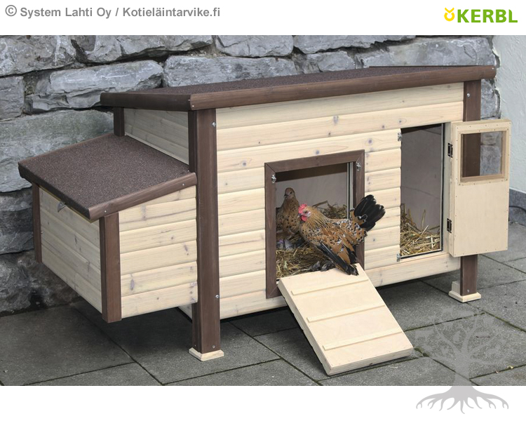 Kerbl Lämmitettävä Kanatalo NoFrost . Integroidulla termostaatilla varustettu lämmitettävä kanatalo. Lattialämmitin pitää pakkasen poissa sisätilasta. Lattialämmitys kytkeytyy lämpötilan laskiessa noin alle +6 celsiusasteen ja kytkeytyy pois lämpötilan noustessa yli +13 celsiusasteen. Lämmitys toimii 24V muuntajalla. Kaksinkertainen seinäneristys (seinän paksuus 3,5cm). Galvanoitu pohjalevy on kestävä ja helppo puhdistaa. Ihanteellinen myös kanojen kasvatukseen. Mukana pesäosa ja kolme ortta. Säädettävä ilmanotto luukku. Ulkoseinät käsitelty vettähylkivällä puunsuoja-aineella. Kääntyvät bitumikatot. Hyvät kokoamisohjeet ja helppo asentaa. Mitat: pituus 146cm, leveys 74cm, korkeus 82cm. Huom! Kanatalo eristää kylmyyttä -20°C asti.