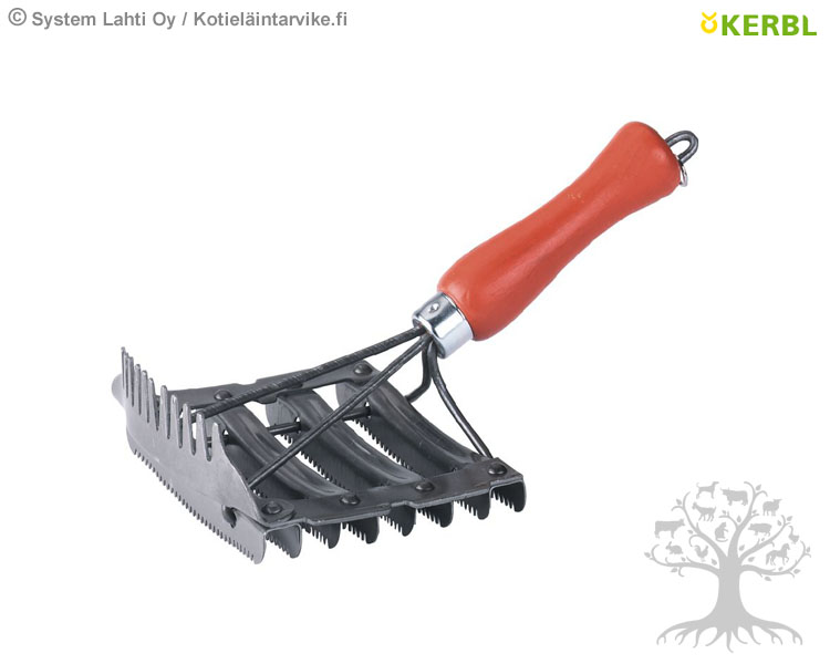 Kerbl Metallisuka kammalla. Metallisuka, jossa on kahdeksassa rivissä tiheät hampaat. Metallisuassa on puinen, punaisen värinen käsikahva. Suka-osa on galvanoitu. Suka-osan pituus 12cm ja leveys 12,5cm. Metallisuassa on 8-rivisen suka-osan lisäksi harvapiikkinen harjakampa. Sopii myös hevosten harjaukseen.