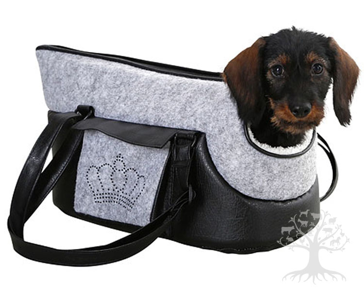 Kerbl Pet Kantolaukku Crown. Laadukas ja tyylikäs kantolaukku lemmikin helppoon ja vaivattomaan kuljettamiseen. Päältä vetoketjulla avattava laukku on edestä avoin, joten lemmikki näkee hyvin mihin ollaan matkalla. Laukun sisävuori on sametinpehmeää karvakangasta ja ulkopinta on faux-keinonahkaa ja huopakangasta. Laukun sisäpuolella on kiinni lyhyt kiinnipitohihna, joten lemmikki pysyy turvallisesti kyydissä. Laukun toisella sivulla on hieno koristekivin koristeltu kruunukuvio. Laukussa on sivutasku tarvikkeiden säilytystä varten sekä säädettävät kantohihnat. Vain käsinpesu. Sisäpuolinen makuutyyny on konepestävä 30°C.