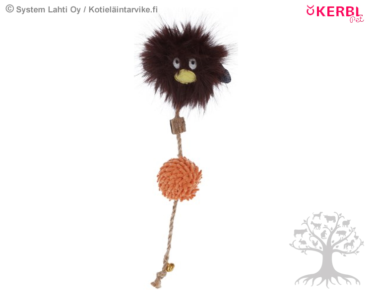 Kerbl Pet Kissan Lelu Safari Emu. Safari Emu kissan lelussa on pörröinen lintu, narupallo ja juuttinaru, jossa on pala matatabia. Juuttinarun päässä on pieni kilikello. Leluun on lisätty kissanminttua.