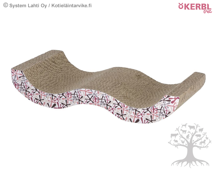 Kerbl Pet Kissan Raapimalauta Flow. Tukeva, kevyt ja kestävä aaltopahvista valmistettu ja aaltomaisesti muotoiltu raapimalauta/ raapimalevy, jossa on mukana kissanmintturouhetta. Kissanminttu saa kissan innostumaan raapimalaudasta, joka on se luvallinen paikka "teroittaa" kynsiä. Kissa saa "hyvän otteen" laudan hieman korotetuista reunoista. Laudan pituus 45cm, leveys 18,5cm ja paksuus 8,5cm. Molemmilla pitkillä sivuilla on hieno printtikuvio. Kissanmintturouhetta ripotellaan laudan päälle.