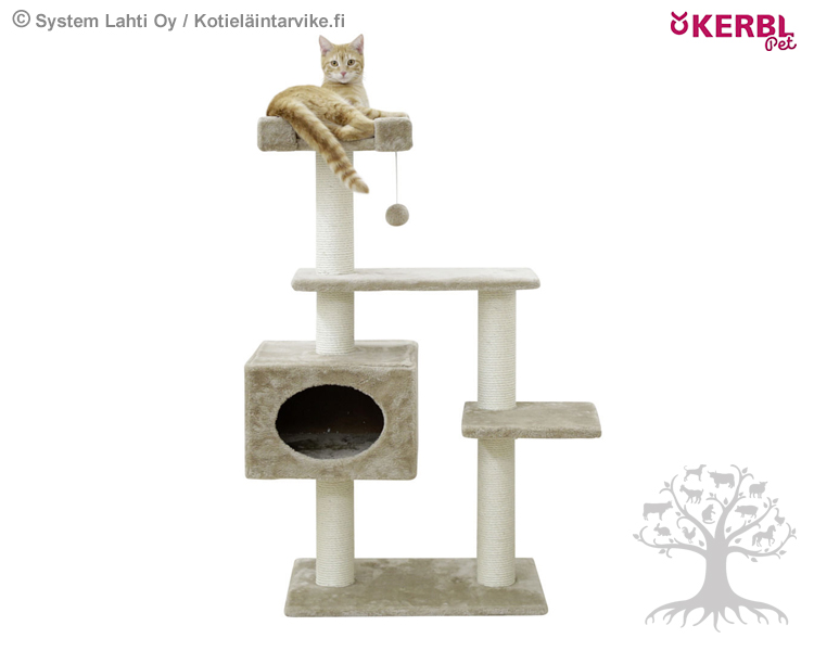 Kerbl Pet Kissan Raapimapuu Emmy. Harmoninen ja kompakti raapimapuu yhdelle tai useammalle kissalle. Kissan leikkejä varten raapimapuusta löytyy sisalnarulla päällystettyä raapimistolppia, kaksi petitasoa, plyysikankaasta valmistettu pehmeä luola sekä raapimapuun ylätasossa roikkuva pehmeä lelupallo. Luola ja petitasot on päällystetty beigellä plyysillä ja raapimatolpat vaalealla sisalnarulla.