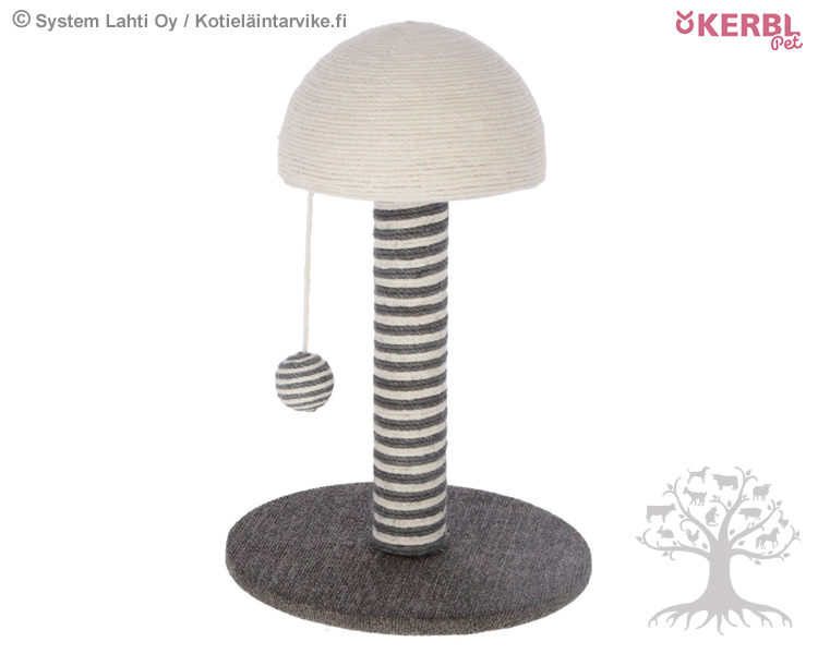 Kerbl Pet Kissan Raapimapuu Mushroom. Pieni ja suloinen sienenmuotoinen raapimapuu kissoille. Sienen lakin ja jalan sisalnarupäällyste houkuttelee kissat raapimaan ja hoitamaan kynsiään. Lakista roikkuu sisalnarun päässä siniharmaa-valkoraidallinen pallo, joka rapisee, kun sitä heiluttaa. Raapimapuun jalusta on kestävää kangasmattoa. Sienen lakki on valkoinen, jalka siniharmaa-valkoraidallinen ja jalusta tummanharmaa.