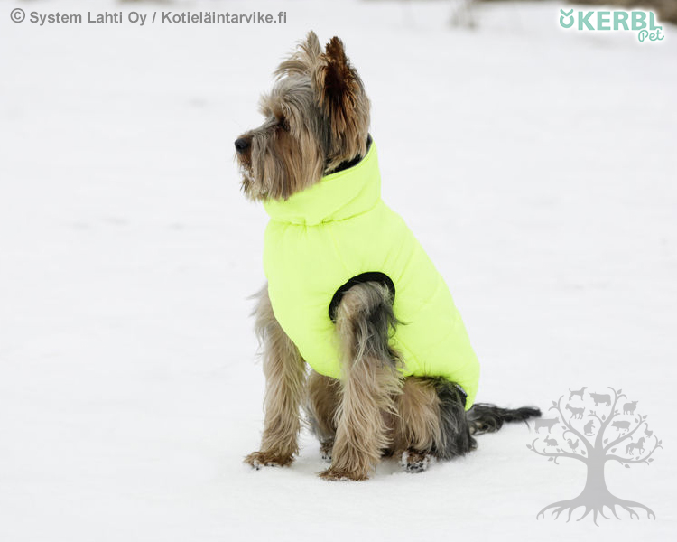Kerbl Pet Koiran Käännettävä Toppatakki. Kevyt, mutta lämmin koiran toppatakki pakkassään ulkoiluhetkiin. Tuulta ja vettä hylkivästä polyesterikankaasta valmistettu koiran kääntötakki, joka on toiselta puolelta harmaa ja toiselta puolelta huomiokeltainen. Keltainen huomioväri tekee koirastasi hämärän aikaan paremmin näkyvän. Takin kaulus on taitettava, joten kumman tahansa värin valitset käytettäväksi, saat toisesta väristä yksityiskohdan kaulukseen. Takki kiinnitetään koiran selän päältä vetoketjulla. Kaulan- ja vatsanympärysaukot sekä etujalkojen aukot on ympäröity joustavalla kuminauhalla, mikä tekee takista hyvin istuvan. Takissa on nailonlenkkeihin kiinnitetyt D-lenkit talutinta varten. Takin talutushihnalenkit on tarkoitettu ainoastaan väliaikaiseen taluttamiseen ja takin kanssa aktiiviseen ulkoiluun suositellaan käytettäväksi kaulapantaa. Takki on konepestävä 30 asteessa. Takki on pakattu kätevään kankaiseen suojapussukkaan, jossa takkia voi säilyttää käyttöajan ulkopuolella.