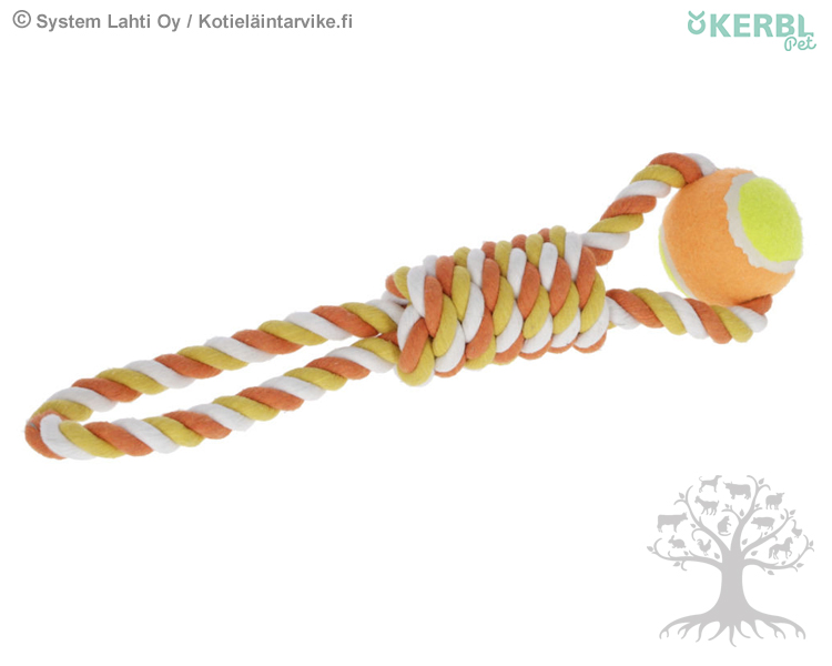 Kerbl Pet Köysilelu Silmukka. Köysilelu yhdellä tennispallolla veto- ja noutoleikkeihin. Kestävän köysilelun silmukassa on tennispallo, josta koiran on helppo napata kiinni. Köyden keskellä on paksu köysikierre, josta koira voi kantaa lelua halutessaan. Lelusta on myös ihmisen hyvä pitää kiinni vetoleikkien aikana, sillä silmukan toisessa päässä on lenkki, josta saa hyvän otteen. Puuvillasta valmistettu köysi on turvallinen ja köysilelulla leikkiminen hoitaa samalla koiran hampaita ja ikeniä.