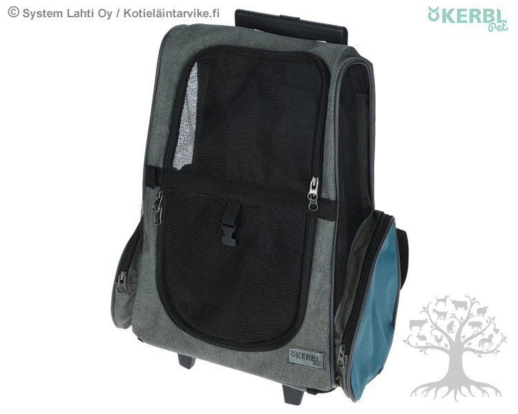 Kerbl Pet Kuljetuslaukku/Kantoreppu Vacation Blue. Laadukas ja monikäyttöinen kuljetuslaukku / kantoreppu lemmikin kuljettamiseen. Laukussa on paljon verkkokangasta, joten lemmikki näkee hyvin mihin ollaan matkalla. Laukun tukevassa pohja-alustassa on tuplapyörät ja päällä teleskooppivetokahva, joten lemmikkiä on helppoa ja vaivatonta kuljettaa. Lisäksi laukkua voidaan käyttää myös kantoreppuna. Laukussa on sivutaskuja tarvikkeiden säilytystä varten sekä vedenpitävä pohja. Laukku on valmistettu kestävästä ja helposti puhdistettavasta Oxford-kankaasta. Verkko-osien ansiosta hyvä ilmanvaihto.