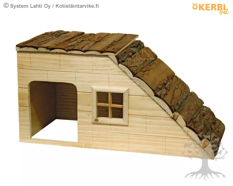 Kerbl Pet Puutalo Rampilla Nature. Luonnollisesta puusta valmistettu pesämökki kaneille ja jyrsijöille. Mökissä on ramppi, joka helpottaa pääsyä katolla olevalle näköalatasanteelle.