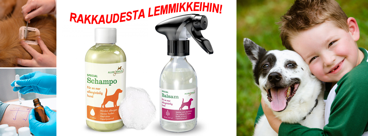 Allergenius® Dog Erikoishampoo ja lemmikin turkkiin jätettävä hoitosuihke Allergenius® Dog Erikoisbalsam tuovat helpotusta monen eläinrakkaan elämään. Nämä huikeat ja ainutlaatuiset Ruotsissa kehitetyt ja valmistetut hoitotuotteet ovat erittäin tervetullut edistysaskel nykypäivän tarpeisiin. Hoitoaineiden säännöllinen käyttö tuo merkittävää hyötyä ja parantavat ihmisen ja lemmikin elämänlaatua monella tavalla. Myynti: www.kotieläintarvike.fi / System Lahti Oy, Seinäjoki.