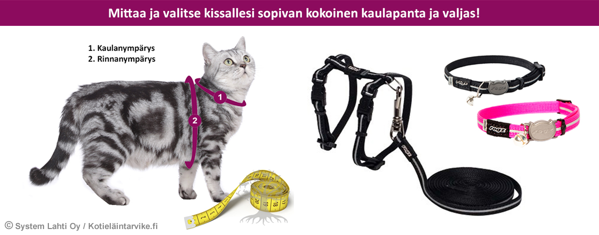 Markkinoilla on erilaisia valjasmalleja. Tärkeintä on löytää kissallesi sopiva koko ja malli. Valjaiden tulee olla napakat, mutta eivät liian tiukat. Kuten kaulapannan kanssa, kahden sormen sääntö on hyvä muistisääntö myös valjaiden istuvuutta testatessa. Totuta kissa valjaisiin vähitellen sisätiloissa, positiivisen vahvistamisen ja herkkujen avulla, ennen ensimmäistä ulkoilukertaa. Kotieläintarvike.fi:stä löydät monipuolisen valikoiman erikokoisille ja -rotuisille kissoille sopivia valjaita.