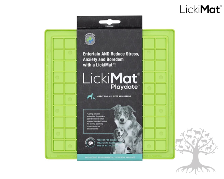 LickiMat® Classic Playdate™ Aktivointimatto. Aito, patentoitu, eläinlääkäreiden kehittämä LickiMat Classic Playdate Aktivointimatto on suunniteltu koirien ja kissojen aktivoimiseen sekä vähentämään stressiä ja ahdistusta. LickiMatin innovatiivinen pintamuotoilu hoitaa lemmikkisi kieltä, puhdistaen kielen pinnalta bakteereja ja näin ollen raikastaa myös hengityksen. Lickimatin nuoleminen lisää syljen eritystä, sylki taas suojaa hampaita sekä ikeniä, auttaen myös ruuansulatusta, koska sylki sisältää entsyymejä, kuten amylasiaa. Täytä LickiMat Aktivointimatto lemmikkisi herkkuruuilla tai LickiMat Sprinkles muruherkuilla ja koe sen monipuoliset hyödyt!