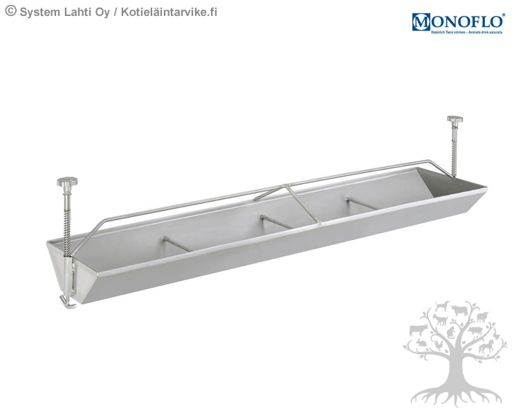 Monoflo Ritiläkaukalo 100cm . Ritiläkaukalo kiinnitetään tukevasti ritilään sioille. Pituus 100cm. Molemmissa päissä T-koukut. Ritiläkaukalossa on 8 ruokintapaikkaa. Valmistettu ruostumattomasta teräksestä.