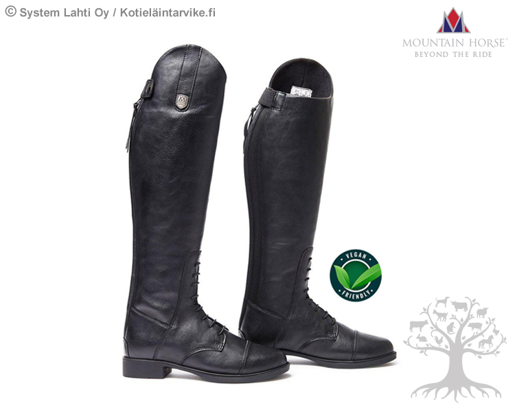 Mountain Horse Ratsastussaapas Veganza Young. Mountain Horsen hienot lasten/nuorten Veganza Young -ratsastussaappaat, jotka on valmistettu vedenpitävästä ja synteettisestä nahasta. Soft Vegan Friendly -synteettinen nahkajäljitelmä on pehmeää, notkeaa ja vedenpitävää. Saappaassa on kaksi pohjallista (Double size), kun toinen pohjallinen otetaan pois, niin saappaasta saadaan ½ -kokoa suurempi. Nuoren ratsastajan jalkakoon kasvaessa, tämä ominaisuus antaa saappaalle mukavasti lisää käyttöaikaa.