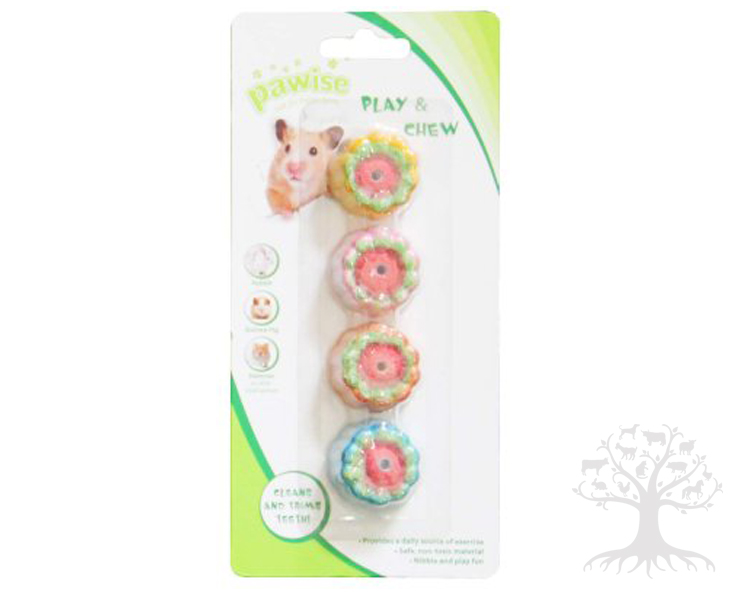 Pawise Mineraalikivi Play & Chew. Värikkäät kukanmuotoiset mineraalikivet kaneille, marsuille, hamstereille ja muille pienille jyrsijöille. Pakkauksessa 4kpl mineraalikiviä. Kivien keskellä reiät, joten ne saadaan haluttaessa roikkumaan häkin kaltereihin (kiinnitysnarua ei mukana). Kivien koko n. 3x2cm. Puhdistaa ja kuluttaa jyrsijän hampaita.