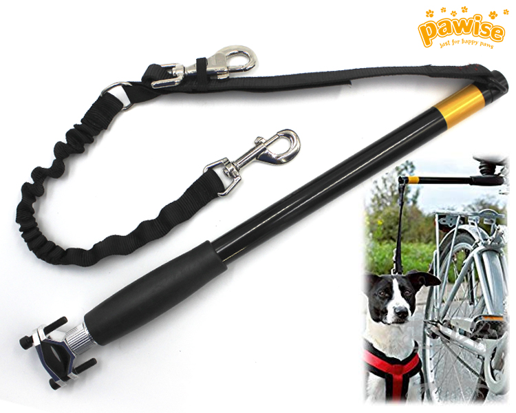 Pawise Pyöräilytalutin Biker-Set. Turvallista pyöräilyä koirasi kanssa. Pyöräilytalutin antaa pyöräilijälle vapaat kädet pyörän ohjaamiseen ja pitää koiran turvallisesti pyörän sivulla poissa polkimista. Taluttimessa on tukeva metallinen tanko, joka on helppo kiinnittää pyörän istuimen alle. Tangon pituus n. 41 cm. Tangon päässä on kiinni nailoninen n. 35cm pitkä talutin pistoolilukolla. Lisäksi mukana tulee n. 35 cm pitkä venyvä jatkopala, joka voidaan halutessaan irrottaa nailontaluttimesta. Taluttimessa on kiinnitysvaihtoehtona lisäksi Velcro turvakiinnitys tarranauhalla jossa hihna löystyy jos siihen kohdistuu äkillinen vetäisy/pysähdys, tämä voi estää koiran ulkoiluttajaa putoamasta pyörän päältä.
