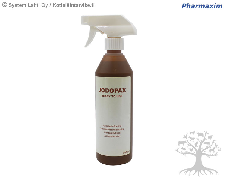 Pharmaxin Desinfiointiaine Jodopax RTU 500ml. Jodopax RTU on desinfiointiaine eläinlääkinnälliseen käyttöön, jolla on nopea ja voimakas teho bakteereihin (myös salmonella), sieniin, itiöihin ja viruksiin. Jodopax on jodoforipohjainen valmiste. Jodoforilla tarkoitetaan jodia, joka on saatu vesiliuokseksi pinta-aktiivisen aineen avulla. Jodopax RTU on käyttövalmis liuos. Käyttöliuos säilyttää täyden desinfiointitehonsa niin kauan kuin liuoksella on ruskea jodinväri. Pinta-aktiivinen aine antaa tuotteelle hyvän puhdistus ja läpäisykyvyn, mutta lika heikentää jodin tehoa. Siksi likainen pinta tulee puhdistaa ennen desinfiointia. Pakkauskoko: 500 ml suihkepullo.