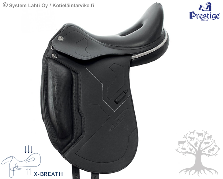 Prestige Koulusatula X-Breath Dressage K D. X-Breath Dressage -koulusatula on yksi Prestigen innovatiivisimmista ja moderneimmista koulusatuloista, jossa on käytetty Prestigen uusinta Coccyx X-teknologiaa. Satulan istuimessa on läpi rungon ja istuimen menevä Coccyx- aukko, joka vapauttaa täysin ratsastajan häntäluuhun (coccyx) ja selkärankaan kohdistuvat iskut/rasitukset. Tästä ainutlaatuisesta ominaisuudesta hyötyvät eniten häntäluustaan ja selkärangastaan helposti kipeytyvät ratsastajat. X-teknologian ansiosta satula pystyy tarjoamaan uudensukupolven hevosille ja tämän päivän ratsukoille parhaimmat mahdolliset edellytykset huipputason suorituksiin. X-Breath Dressage satulamallia on valmistettu vuodesta 2015 lähtien.