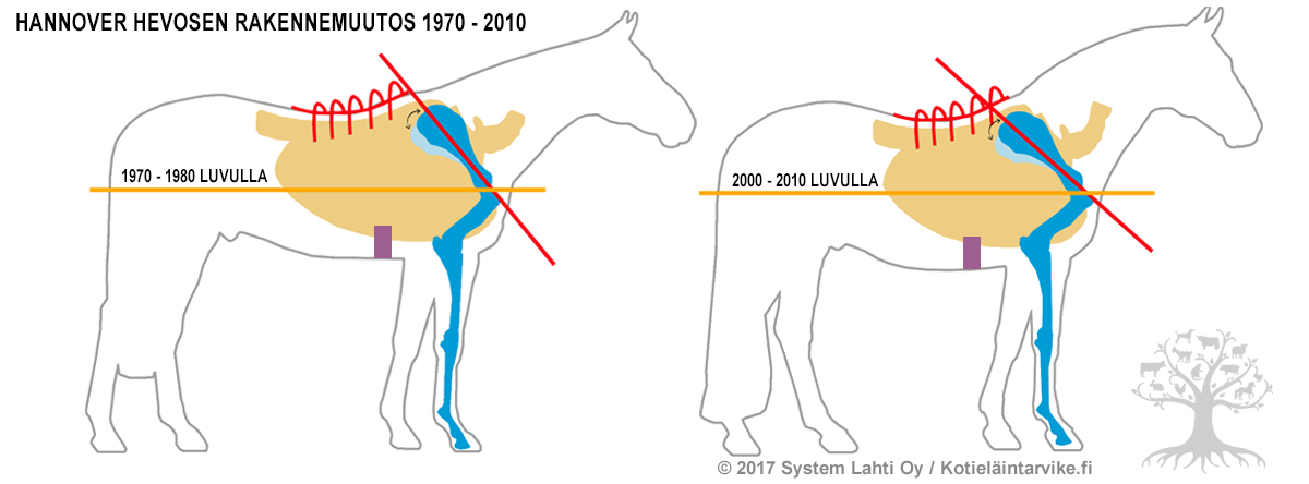 Hevosen rakennemuutoksia eri vuosikymmienien ajalta voi silmin nähden havaita yllä olevista Hannover -hevosen rakennekuvista. Tutkimalla myös muiden hevosrotujen eri vuosikymmenien ajoilta otettuja jalostuskuvia, voi näitä samoja havaintoja tehdä lähes kaikista ratsastusurheilussa käytetyistä hevosroduista.