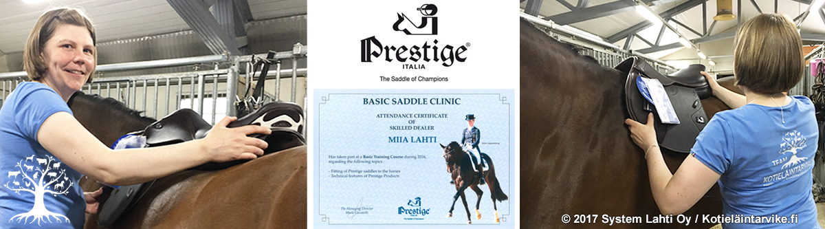 Prestigen jatkuvasti kouluttama ammattitaitoinen satulansovittaja Miia Lahti tekee Prestige satuloiden muokkauksia Kotieläintarvike.fi myymälässä ja satulansovituksia asiakkaan toivomusten mukaan noin 50km säteellä Seinäjoelta tai vaihtoehtoisesti Lapualla Kojolan tallilla. Satuloiden sovitus aloitetaan ensin mittaamalla ja tarkastelemalla hevosen anatomiaa ja rakennetta. Sen jälkeen sovitetaan eri satulamalleja, jonka jälkeen sopivaksi katsotut mallit koeratsastetaan. Hevosen liikkuessa sen monessa eri kerroksessa olevat lihakset liikkuvat tavalla, joita ei voida havaita satulaa sovittaessa paikallaan seisovasta hevosesta. Yhtä tärkeää on myös ratsastajan istunta, asento ja tuntuma hevoseen. Vasta sen jälkeen voidaan todeta satulan sopivuus. Hevosen lihaksisto muuttuu jatkuvasti, joten satulan rungon muokkausmahdollisuus Prestigen omalla muokkauslaitteella on erittäin hyödyllinen ja tärkeä ominaisuus.
