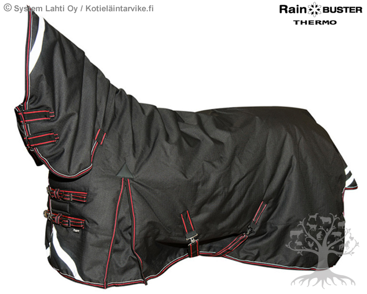 Rain Buster Thermo Ulkotoppaloimi 300g Full Neck Black. Erittäin käytännöllinen ja hyvin istuva ulkotoppaloimi Full Neck- kaulakappaleella ja 300g vanutäytteellä sekä koko loimen reunaa kiertävällä heijastintereellä. Lisäksi loimen kaulaosassa sekä häntäläpässä on hyvin näkyvät heijastinnauhat. Loimen päällyskangas on helppohoitoista, hengittävää ja kestävää 1200 denierin -kangasta, joten siinä on erinomainen veden- ja tuulenpitävyys. Loimessa on liukas nailonvuorikangas, joka ehkäisee mahdollisia hankaumia. Loimessa lapalaskokset, ristivyöt, edessä säädettävät solkikiinnitykset, kaulakappaleessa tarranauhakiinnitykset, häntäläppä ja häntäremmi.