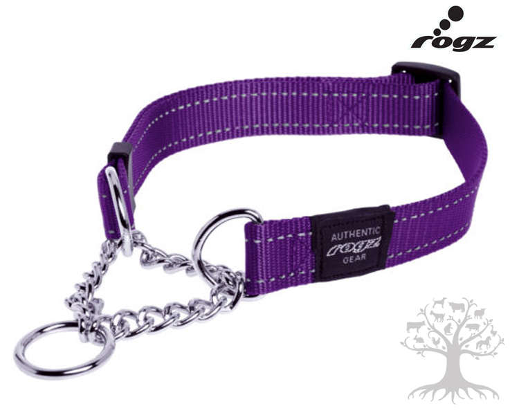 Rogz Puolikuristava Nailonpanta Utility Lila. Erittäin laadukas ja pehmeästä nailonista ja kromatusta teräsketjusta valmistettu puolikuristava kaulapanta, joka soveltuu hyvin myös vahvoille ja aktiivisille liikkujille. Säädettävä kaulanympärys tekee pannasta erittäin hyvin istuvan. Tehokkaat heijastinpunokset parantavat näkyvyyttä pimeällä. Puolikuristava panta on helppo ja nopea pukea juuri ennen ulkoilua. Pannan säätöhihnoissa on myös stopparit, jotka estävät pannan löystymisen. Pannan O- ja D- renkaat ja ketju on kromattua terästä. Kaulapannan ketjun pituus kaikissa koossa on 12cm, ketjun paksuus on suhteessa pannan kokoon/pituuteen.