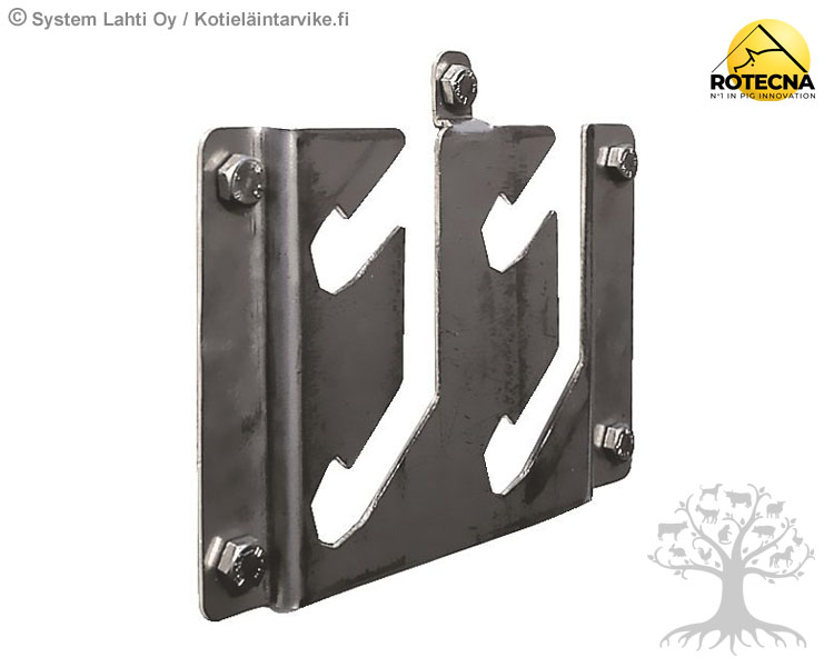 Rotecna Seinäkiinnike TR-5 . Rehuautomaatti voidaan helposti irrottaa seinäkiinnikkeistä esim. puhdistusta varten.