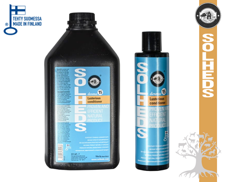 Solheds Derma15 Hoitoaine Lusterious Conditioner. Derma15 on tutkitusti tehokas ihoystävällinen hoitoaine koirien, kissojen ja hevosten karvapeitteen ja jouhien hoitoon. Derma15 tuo karvapeitteeseen loistavaa kiiltoa, tuuheutta, vähentää hilsettä sekä sähköisyyttä ja tekee turkista helposti harjattavan. Kosteuttaa myös ihoa.