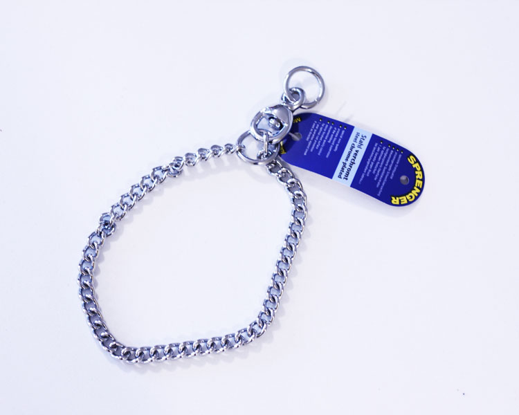 Sprenger Kromattu Ketjupanta Litteä 3mm. Litteä linkkinen ketjukaulain Sprengeriltä. Kiristävä kaulain on valmistettu kromatusta teräksestä ja ketjun litteät lenkit ovat 3 mm vahvuiset. Ketjun toisessa päässä pöyrivä rengas, jokanka ansiosta ketju pysyy paremmin paikoillaan koiran kaulassa. Soveltuu myös hienosti näyttelykaulaimeksi. Tiheät lenkityksen vuoksi kaulain voi kuluttaa pidempää turkkia. Suositellan max. 40 kg painaville koirille.