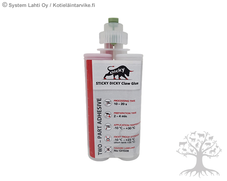 Sticky Dicky Sorkkaliima 200ml. Sticky Dicky on 2-komponenttiliima. Kuivuu noin 10-20 sekunnissa. Kovettumisen jälkeen liimasta ei tule haurasta, vaan se tarttuu voimakkaasti sorkkaan ja kenkään. Laadukas 200ml patruuna, joka voidaan avata ja sulkea ilman työkaluja. Suojakorkki laitetaan takaisin paikalleen, jolloin liima säilyy ilmatiiviisti seuraavaan käyttökertaan. Tarttuu voimakkaasti puu-, kumi- ja polyuretaanikenkiin. Sekoitussuutin takaa komponenttien hyvän sekoittumisen. Suositellaan käyttämään Sicky Dickyn omia sekoitussuuttimia (tuote 13050436). 200ml pullo riittää 9-11 käyttökertaan. Liima ei sisällä syöpää aiheuttavia ainesosia. Optimaalinen käyttölämpötila -10C - +30C välillä. Parhaan tuloksen saavuttamiseksi kynnen tulee olla puhdas ja kuiva.
