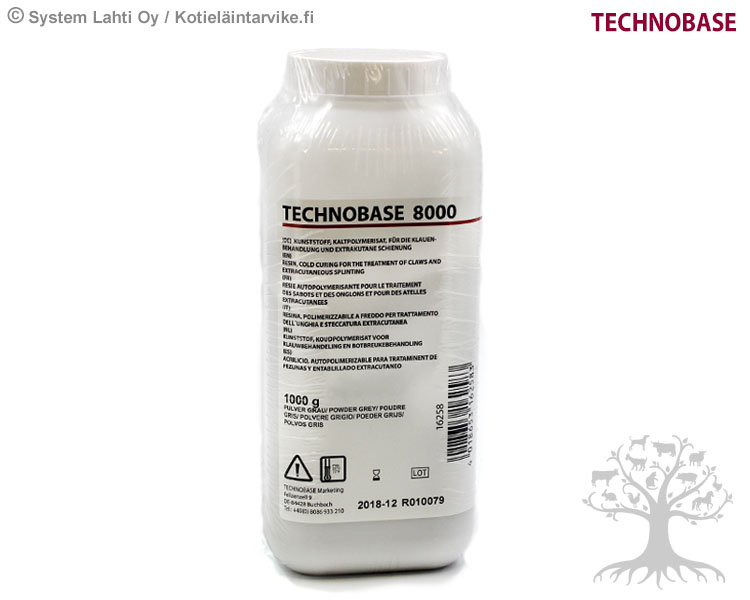 Technobase Jauhe 8000, 1000g. Technobase on nopeasti kuivuva ja ihanteellinen materiaali sorkkasairauksien hoitoon (vioittuneet sorkat, virheasentojen korjaus). Nykyaikainen Technobase kattaa monenlaisia eläinlääkinnällisiä käyttö- ja hoitotapoja. Technobase 8000 kovettuu täysin alle 4 minuutissa lämpötilan ollessa 20°C. Tämä tarkoittaa, että käsintehty mallinnus täytyy tehdä välittömästi sekoittamisen jälkeen, nopea käsittely. Massa on joustava ennen kovettumista, eikä se tartu käsiin tai lastaan. Technobase on erinomainen liima!