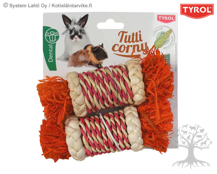 Tyrol Jyrsijöiden Lelu Tutti Corny 2kpl. Lelurullat pureskeluun ja leikkiin kaneille ja jyrsijöille. Valmistettu maissinlehdistä. Valmistuksessa käytetty ainoastaan turvallisia materiaaleja ja väriaineita, joten ne ovat turvallisia pureskeltaviksi sekä pitämään jyrsijän hampaat kunnossa.