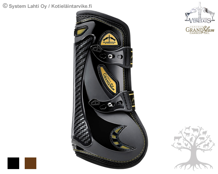 Veredus Carbon Gel Grand Slam Vento Jännesuojat. Erittäin korkealaatuiset, huipputekniset ja kestävät hiilikuitua sisältävät etujalan jännesuojat, joissa on käytetty ihan uudenlaista ilmanvaihto- ja suojausteknologiaa. Uusi innovatiivinen ilmanvaihtotekniikka pitää hevosen jalkojen lämpötilan tasaisena vähentäen rasituksen aikana hevosen jalkoihin kohdistuvaa lämpörasitusta, edistäen näin myös niiden rasituksen jälkeistä palautumista. Suojien uusi "sirompi" ja anatomisempi muotoilu tarjoaa hevoselle maksimaalisempaa liikkumavapautta ja mukavuutta. Suojissa on kaksi joustavaa ja säädettävää nepparikiinnitteistä kiinnitysremmiä, jotka takaavat tukevan kiinnityksen (neppari loksahtaa omaan koloonsa). Suojissa on todella näyttävät kultaiset Vereduksen Grand Slam -logot. Grand Slam Carbon Gel Vento -suojat on nimetty Rolex Grand Slam of Showjumping -kilpailun voittajan Scott Brashin kunniaksi. Valmistettu Italiassa. Katso esittelyvideo!