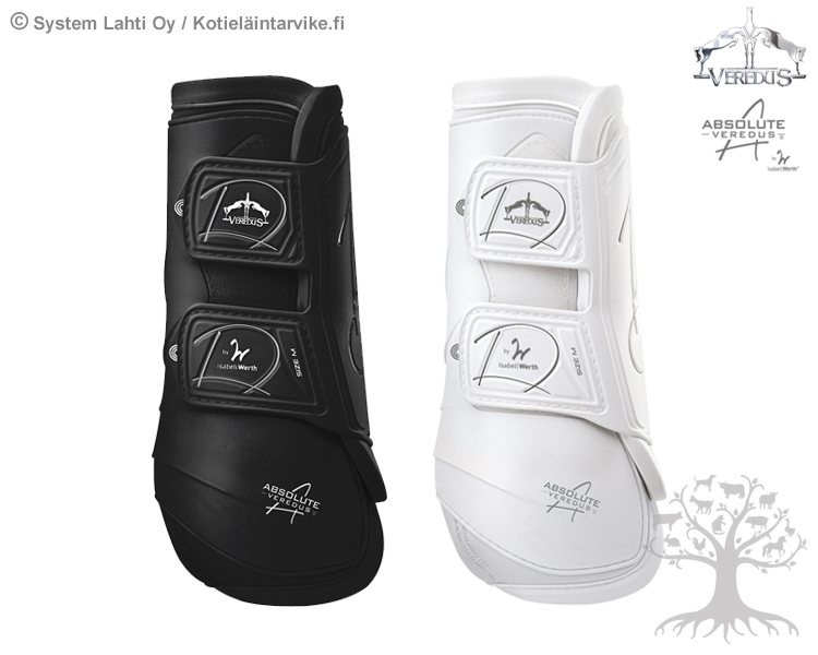 Veredus Koulusuojat Absolute Easy Strap Front. Vereduksen Absolute -koulusuojat on suunniteltu ja kehitetty yhteistyössä maailman parhaimman kouluratsastaja Isabell Werthin kanssa. Koulusuojat on anatomisesti muotoillut niin, että ne mahdollistavat hevoselle maksimaalisen liikkumavapauden. Suojien innovatiivinen muotoilu ja materiaalit takaavat hevosen jänteille ja nivelsiteille parhaan mahdollisen tuen treenien aikana. Lisäksi suojien elastinen Polyflex -ulkokuori (elastic polyurethane) suojaa tehokkaasti koviltakin iskuilta.
