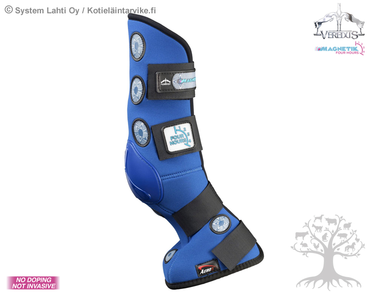 Veredus Magnetik Four Hours Boots Etujalansuojat. Erittäin korkealaatuiset, tehokkaat, kevyet, anatomisesti muotoillut ja helppokäyttöiset etujalan magneetti -tallisuojat, joissa on 40 kpl neodymium magneettia. Yhden magneetin teho on jopa 2400 Gaussia. Magneettilevyt jakavat magneettihoidon tasaisesti, tehokkaasti ja kokonaisvaltaisesti koko jalan alueelle. Four Hours = magneettisuojilla saadaan toivottu tulos jo neljässä tunnissa! Tallisuojat on valmistettu erittäin pehmeästä ja helppohoitoisesta Aerox -neopreenista, joka on vuorattu ja viimeistelty joustavalla ja pehmeällä Lycralla. Suojan kevyt ja hengittävä materiaali takaa jaloille optimaalisen lämpötilan, mikä vähentää jalkojen lämpörasitusta. Suojissa on anatomisesti muotoillut vuohissuojat ja joustamattomat tarranauhakiinnitysremmit, jotka pitävät tallisuojat tukevasti ja hyvin paikoillaan. Myydään pareittain. Valmistettu Italiassa.