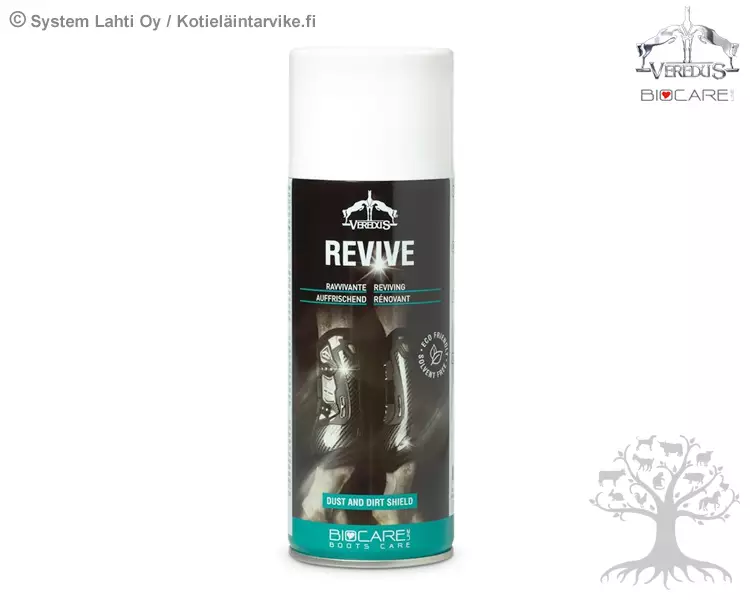 Veredus Suojien Kiillotussuihke Revive. Veredus Revive Spray on ihanteellinen ja helppokäyttöinen tuote hevosen jalkasuojien ja muiden tarvikkeiden huoltoon. Revive -kiillotussuihke antaa uutta kiiltoa suojien pinnoille sekä tekee pölyä ja likaa hylkivän pinnan. Veredus Revive pitää hevosen suojat pitkäikäisinä ja hyväkuntoisena. Veredus Revive on ympäristöystävällinen, turvallinen ja tahraamaton, ei sisällä liuottimia tai muita myrkyllisiä aineita.