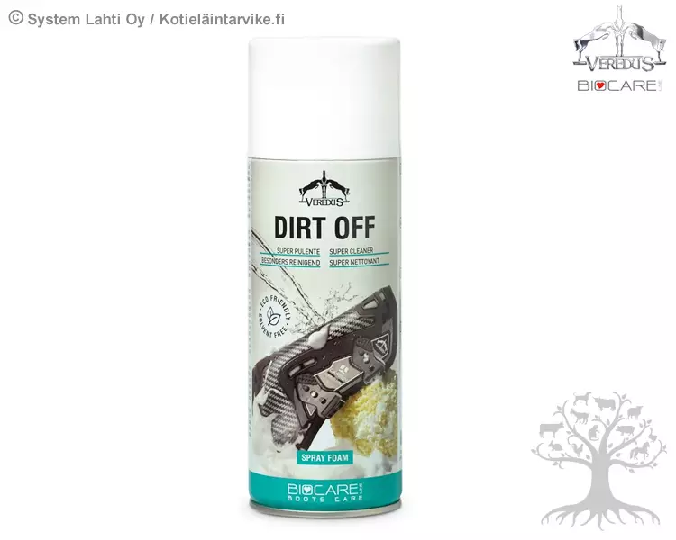 Veredus Suojien Puhdistusvaahto Dirt Off. Veredus Dirt Off on ihanteellinen ja helppokäyttöinen puhdistusvaahto suojien ja muiden tarvikkeiden puhdistamiseen. Dirt Off -puhdistusvaahto puhdistaa suojista kaiken lian, hien ja pölyn. Veredus Dirt Offin käyttö pitää suojat pitkäikäisinä ja hyväkuntoisena sekä kiinnityshihnat joustavina. Sopii hevosen suojiin, jalustimiin ja moniin muihin tarvikkeisiin. Veredus Dirt Off on ympäristöystävällinen, turvallinen ja tahraamaton, ei sisällä liuottimia tai muita myrkyllisiä aineita.