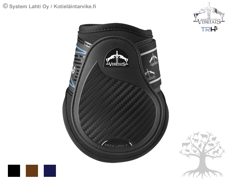 Veredus TRH5 Takajalansuojat. Erittäin laadukkaat ja kestävät takajalansuojat, jotka on suunnattu pääasiassa treenikäyttöön. Suojien anatominen muotoilu tarjoaa hevoselle erinomaista liikkumavapautta ja mukavuutta. Suojissa on joustava ja säädettävä nepparikiinnitteinen kiinnitysremmi, joka takaa tukevan kiinnityksen (neppari loksahtaa omaan koloonsa). Suojissa on hienot Vereduksen logot. Valmistettu Italiassa.