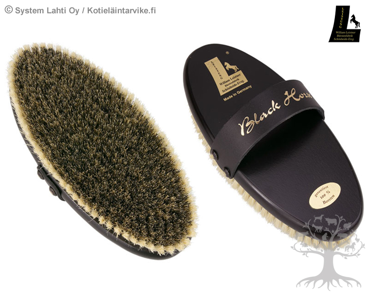 William Leistner Black Horse 1b58. William Leistnerin Black Horse erikoisharja on nimensä mukaisesti suunnattu tummille ja mustille hevosille. Harjakset on valmistettu aidosta villisiankarvasta. Harjan lyhyet, keskivahvat ja tiiviit harjakset irrottavat hevosen oman ihon rasvaa karvan pintaan tehden karvasta upean kiiltävän. Lisäksi ihorasva kosteuttaa karvaa ja vähentää karvan sähköisyyttä. Harjan ulkoreuna valkaistut villisianharjakset viimeistelevät karvan hienosta pölystä. Puolikarkea harja sopii lian irrottamiseen ja karvan kiillottamiseen. Suosittelemme tätä harjaa jokaiselle tumman hevosen omistajalle "must-have". Made in Germany - Valmistettu Saksassa!