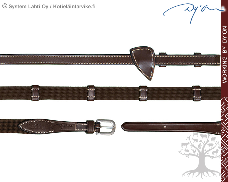 Working by Dyon Ohjat Web 5/8" with 7 Leather Loops. Dyonin erittäin laadukkaat kangasohjat, joissa on kermanväriset tikkaukset ja ruostumattomat terässoljet. Working by Dyon -mallisto on valmistettu laadukkaasta ja kestävästä Dy’on Buffalo -nahasta. Kangasohjassa on nahkastopparit (7 leather loops), jotka auttavat saamaan pitävän otteen. Ohjien leveys 5/8", 16mm. Ohjissa on tyylikkäät D -malliset martingaalistopparit. Ohjien piilosoljet tekevät suitsista huolitellun näköiset. Sopii kaikkiin Working by Dyon suitsimalleihin.